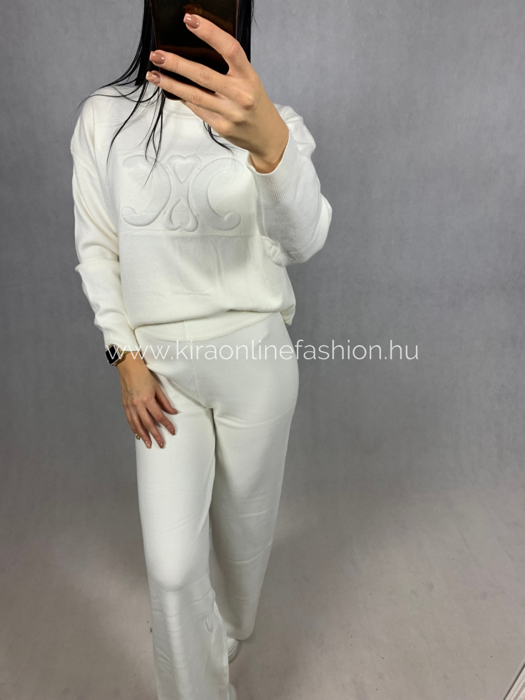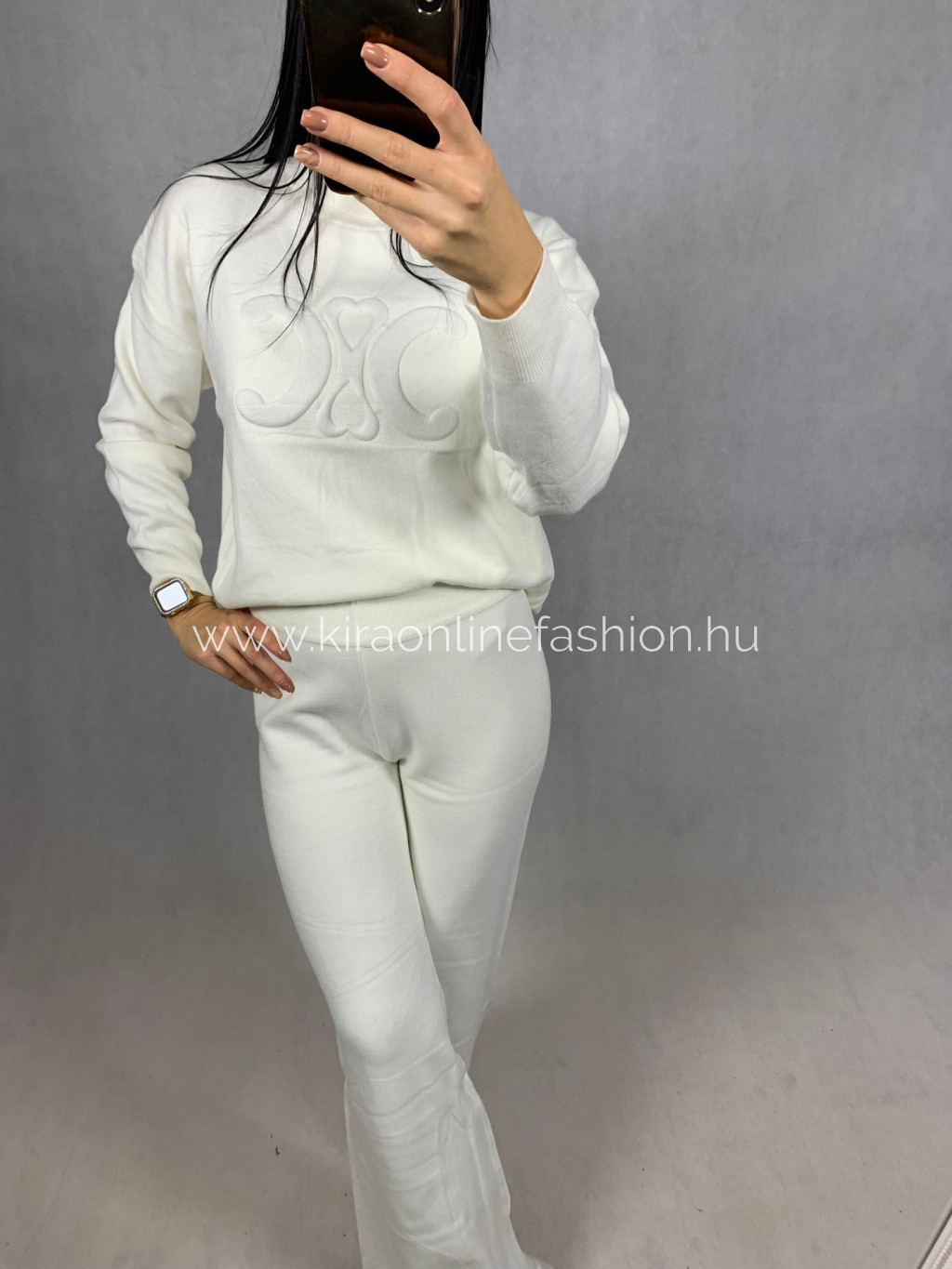 Fehér oversize finom kötött anyagú garbó pulcsi gumírozott derekú széles szárú nadrággal. Méret nélküli.