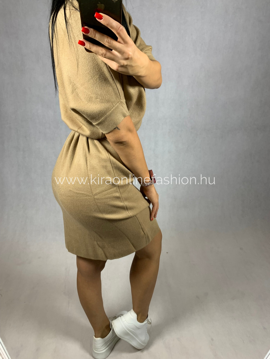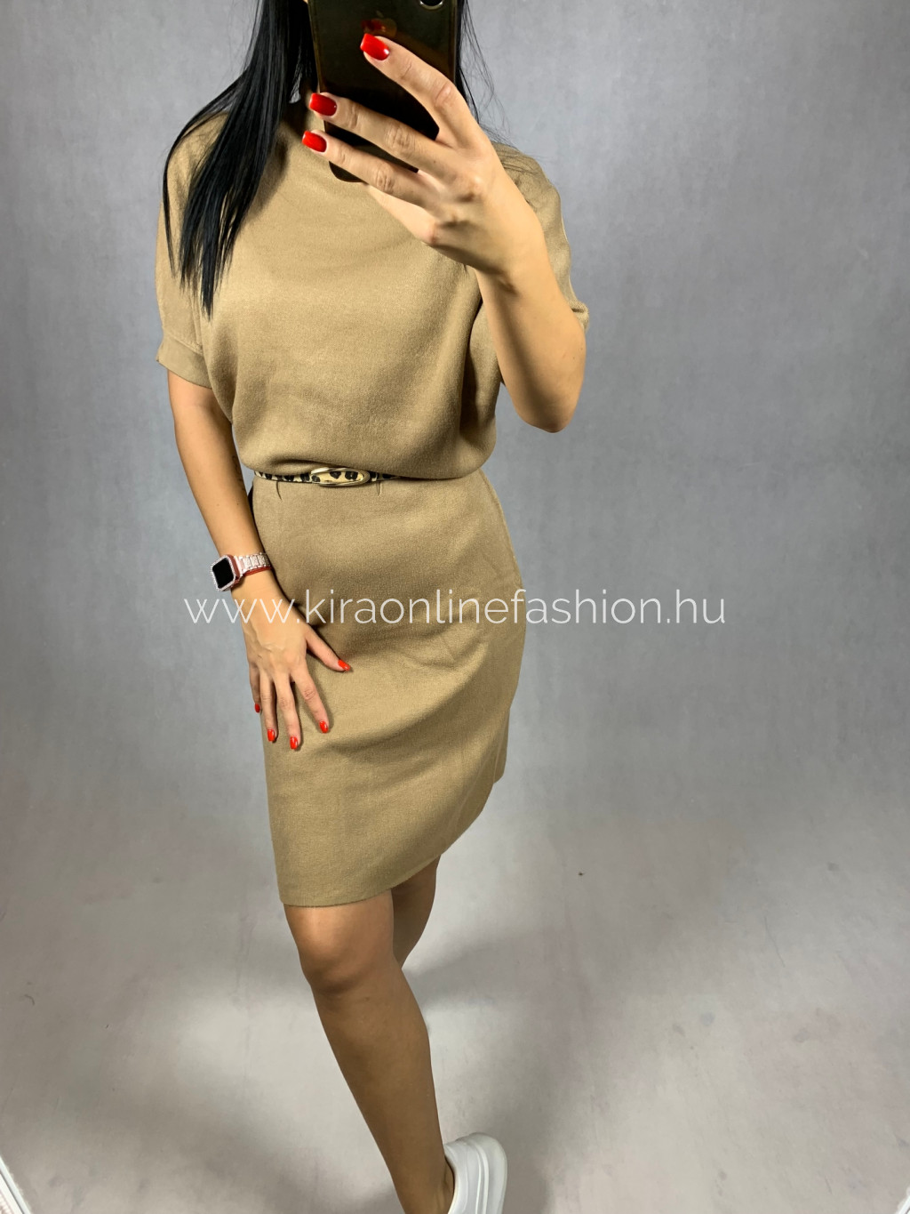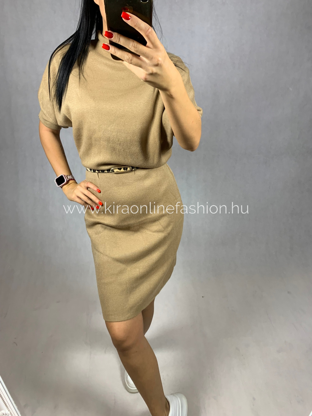 Karamell színű finom kötött anyagú laza fazonú ruha, tunika ocelot mintás övvel. Méret nélküli.