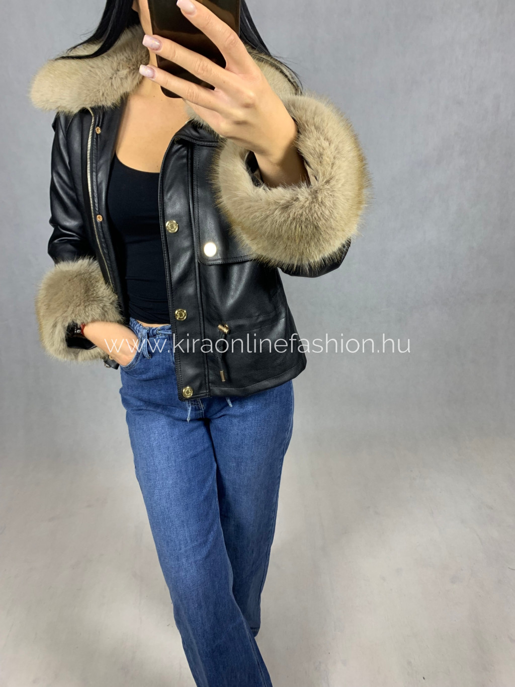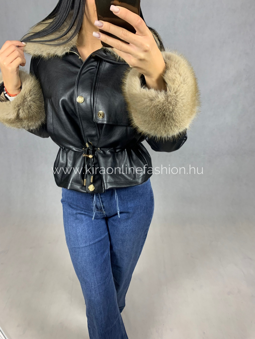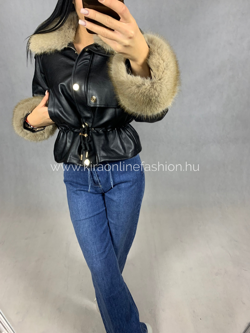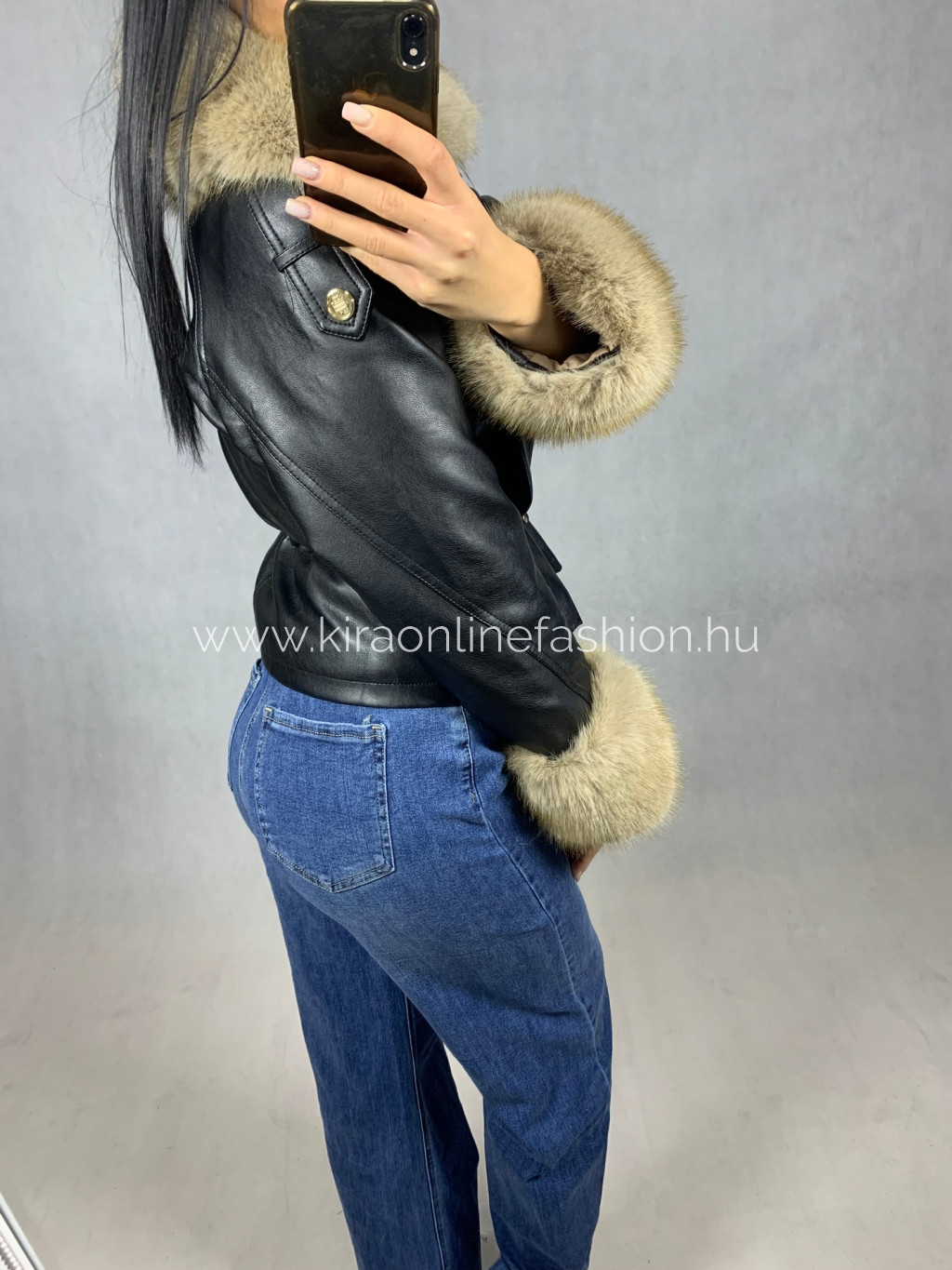 Fekete színű oversize fazonú derekán szabályozható szőrmével díszített bélelt bőrdzseki. Méretezve van.