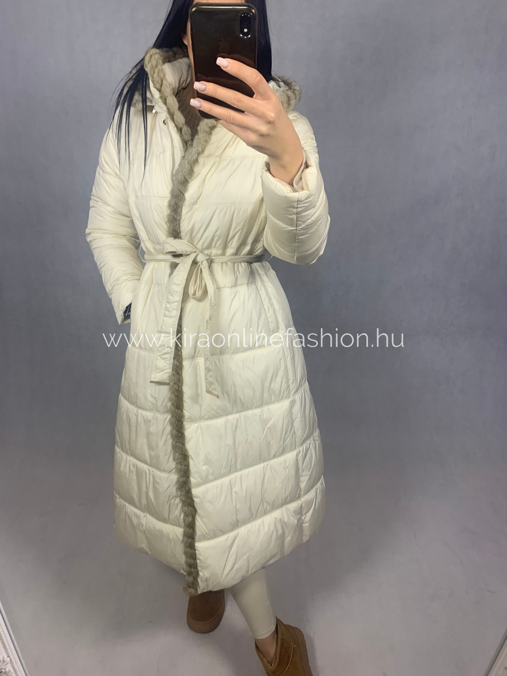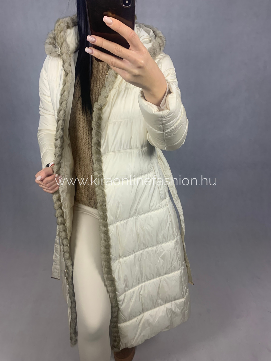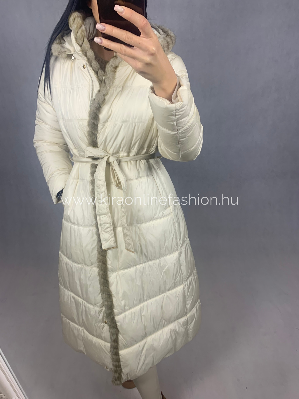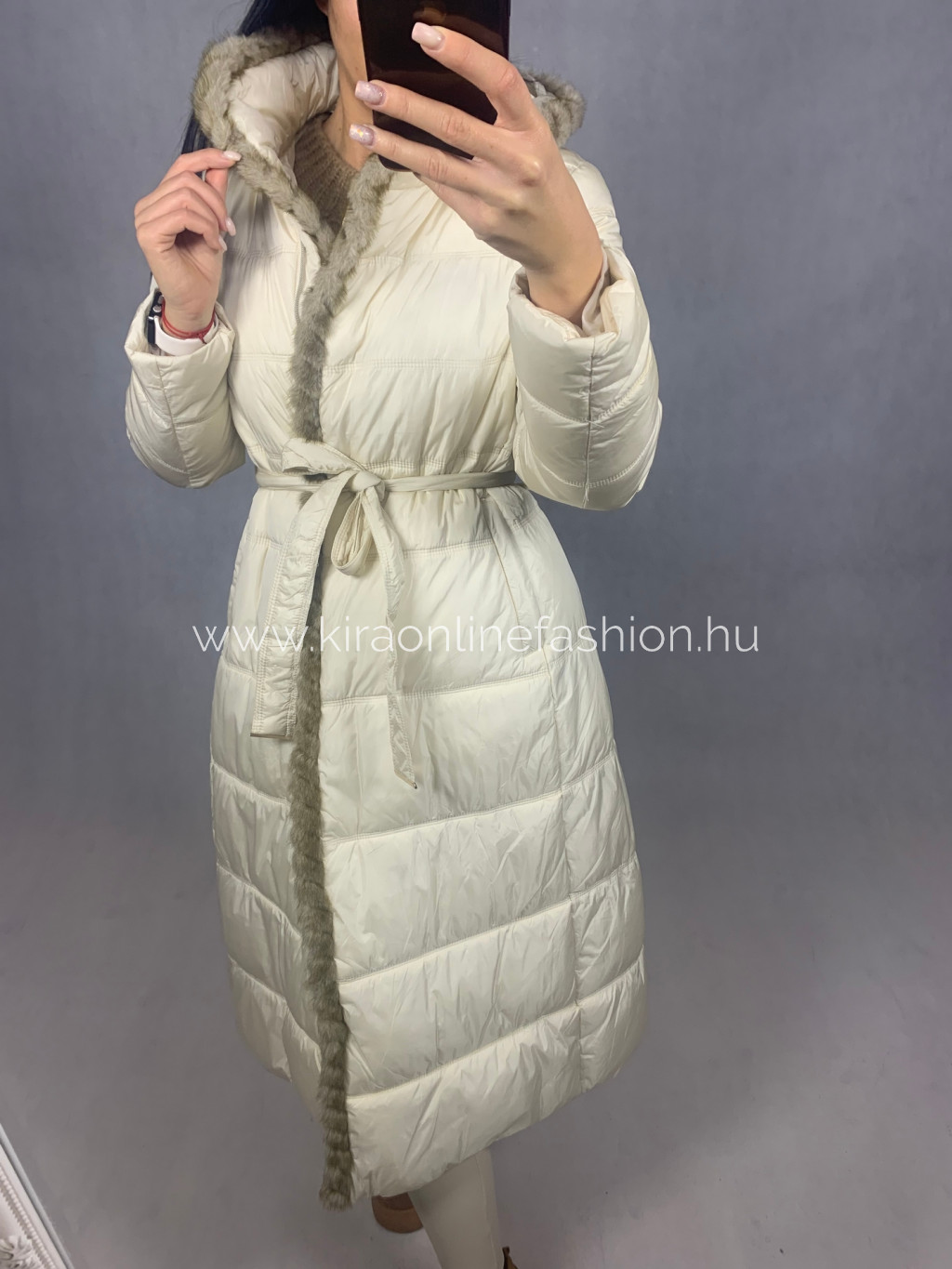Krém színű steppelt vastag kabát az eljén cipzárral, patentokkal. Szőrmével díszítve, kapucnival. Méretezve van.