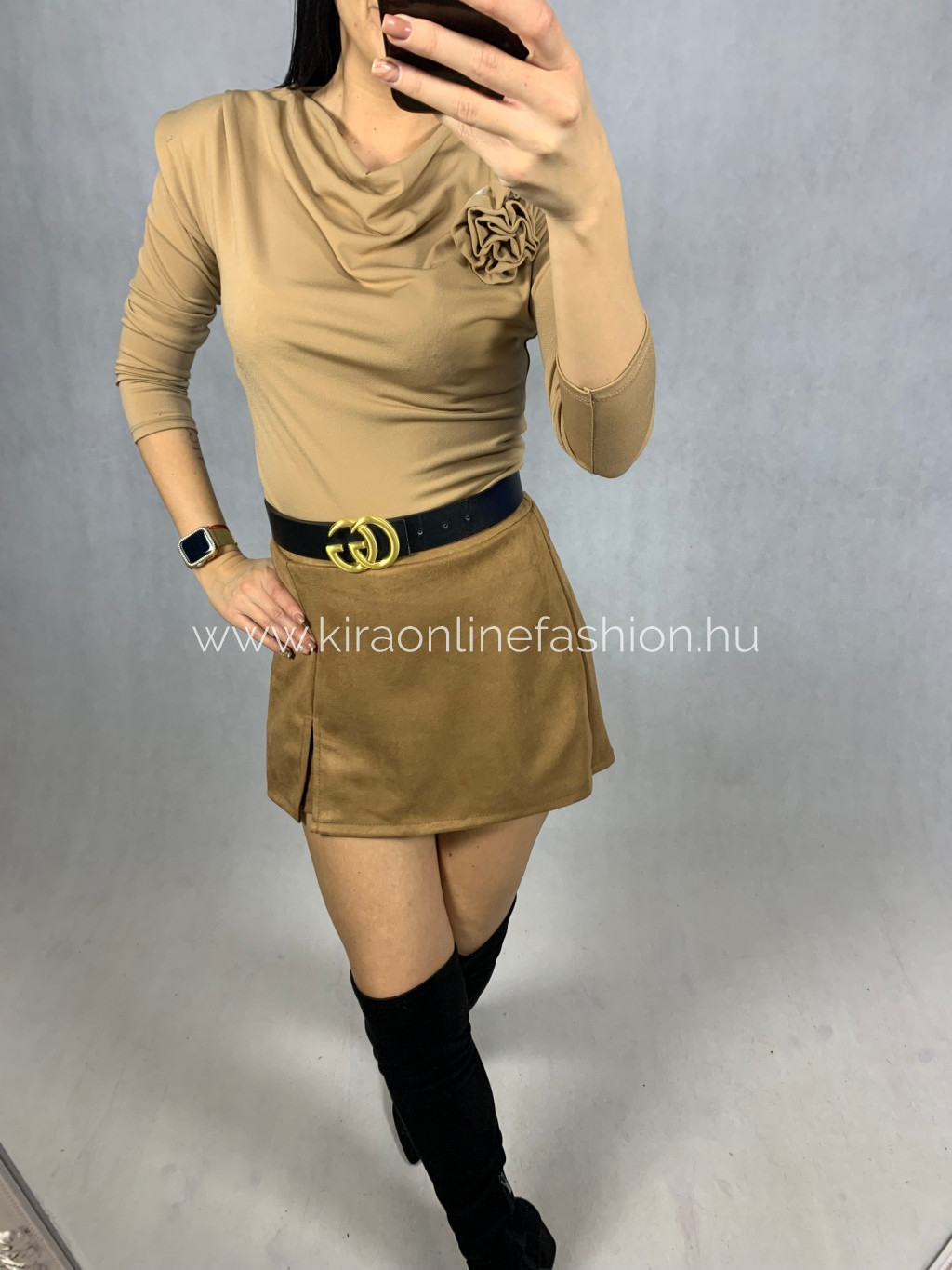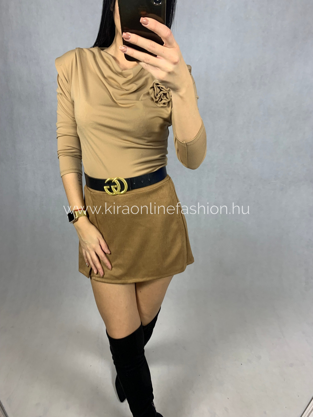 Karamell színű polamid anyagú felső válltöméssel, virág kitűzővel, ami levehető. Méret nélküli. S-L méretig ajánlom.