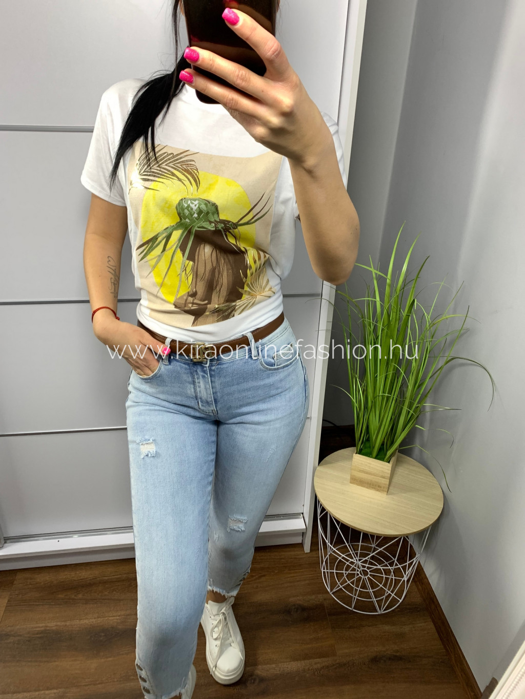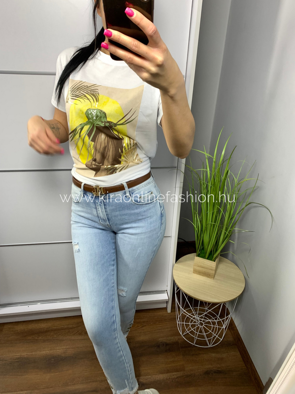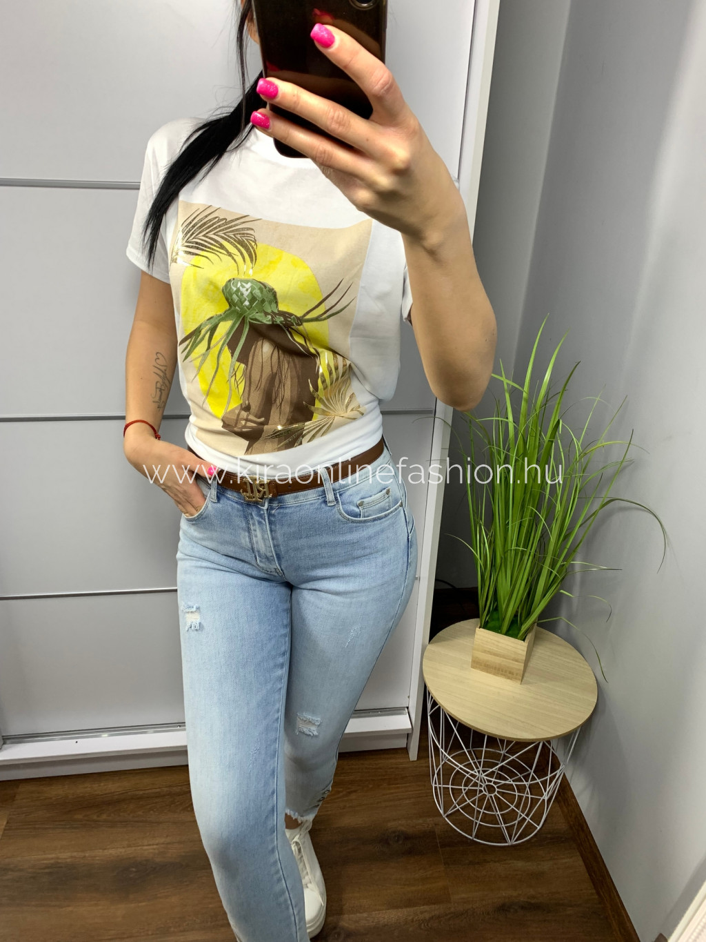 Fehér pamut anyagú póló sárga mintával az eéején. Méret nélküli. S-L méretig ajánlom.