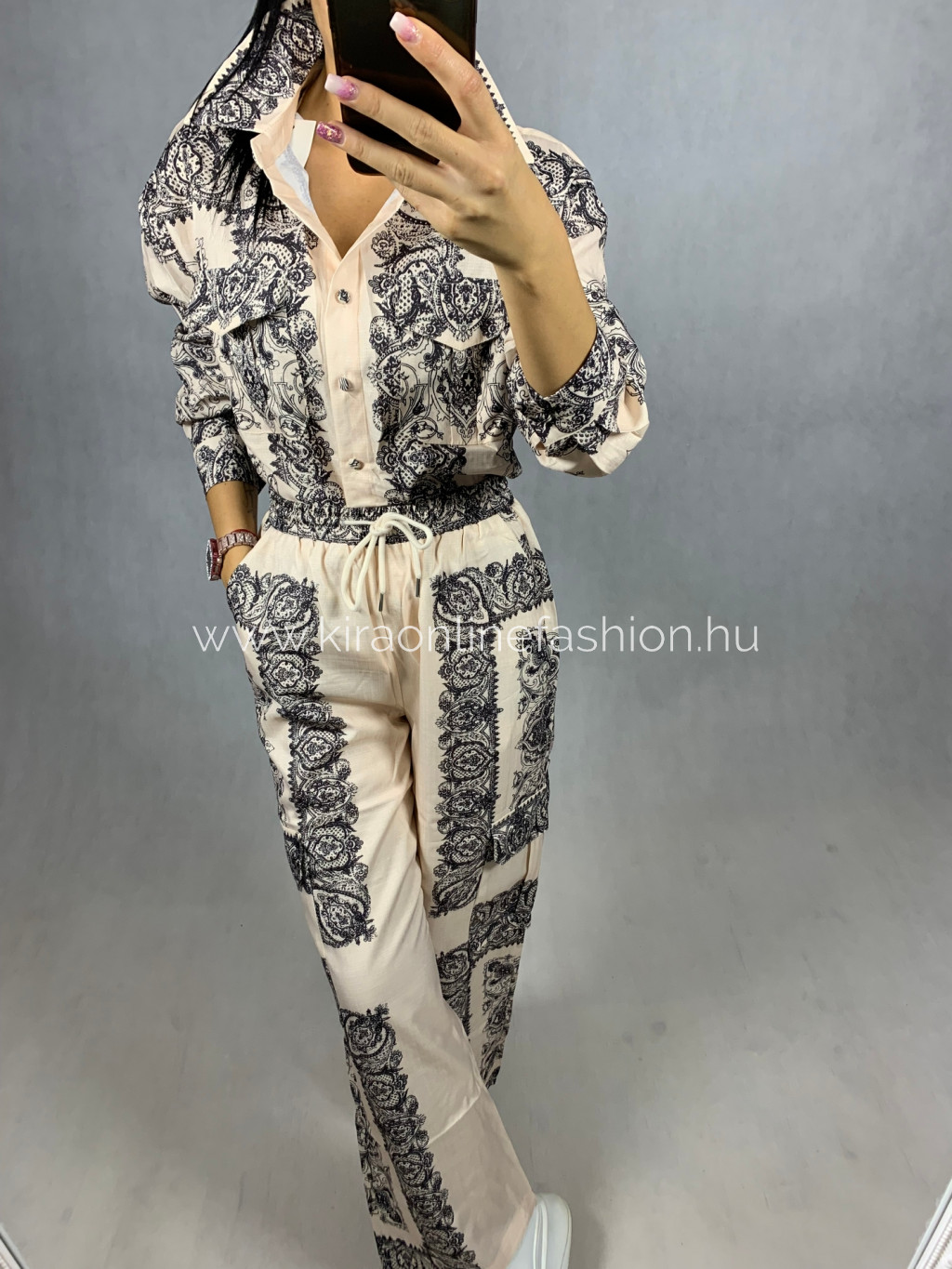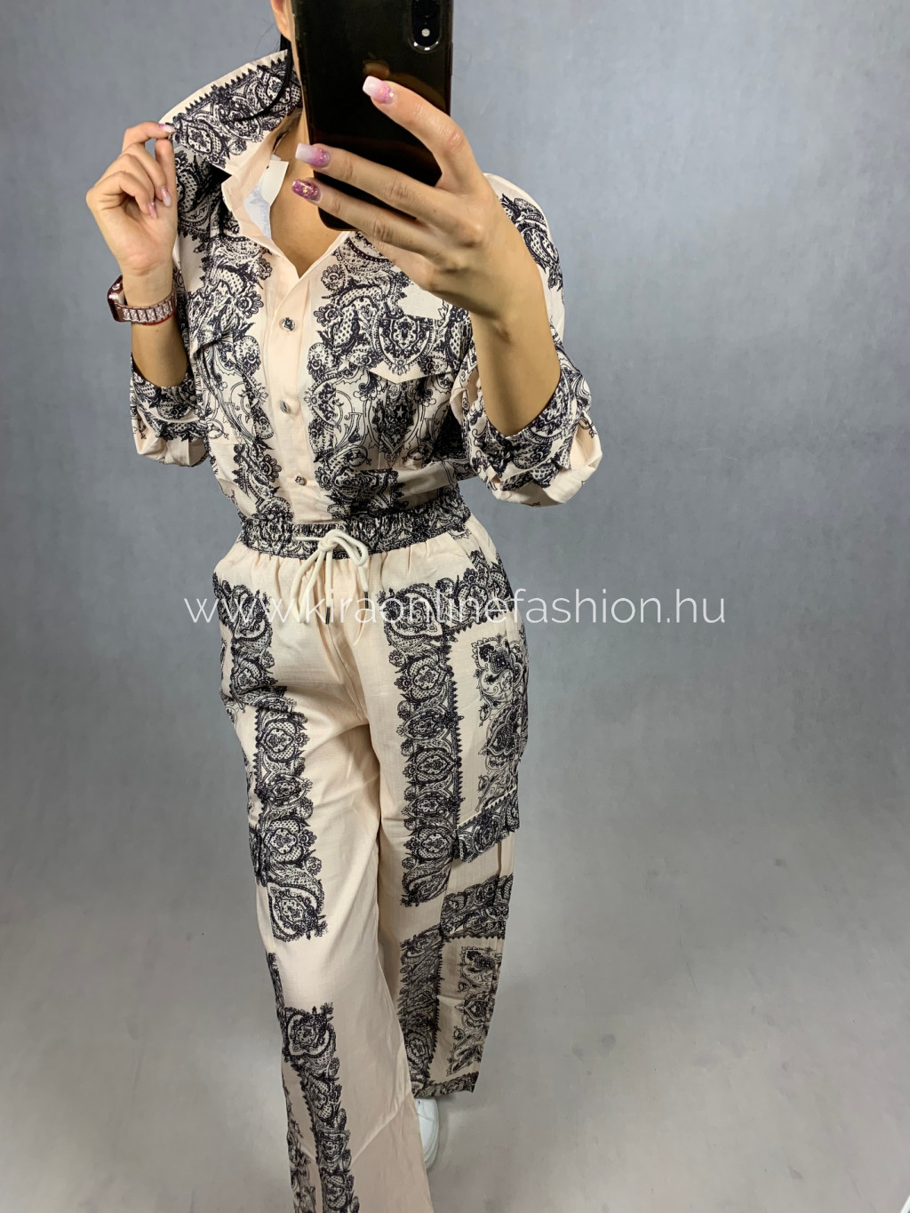 Ekrű-fekete mintás gumírozott derekú széles szárú nadrág és oversize fazonú ing szett. Egyméretes.