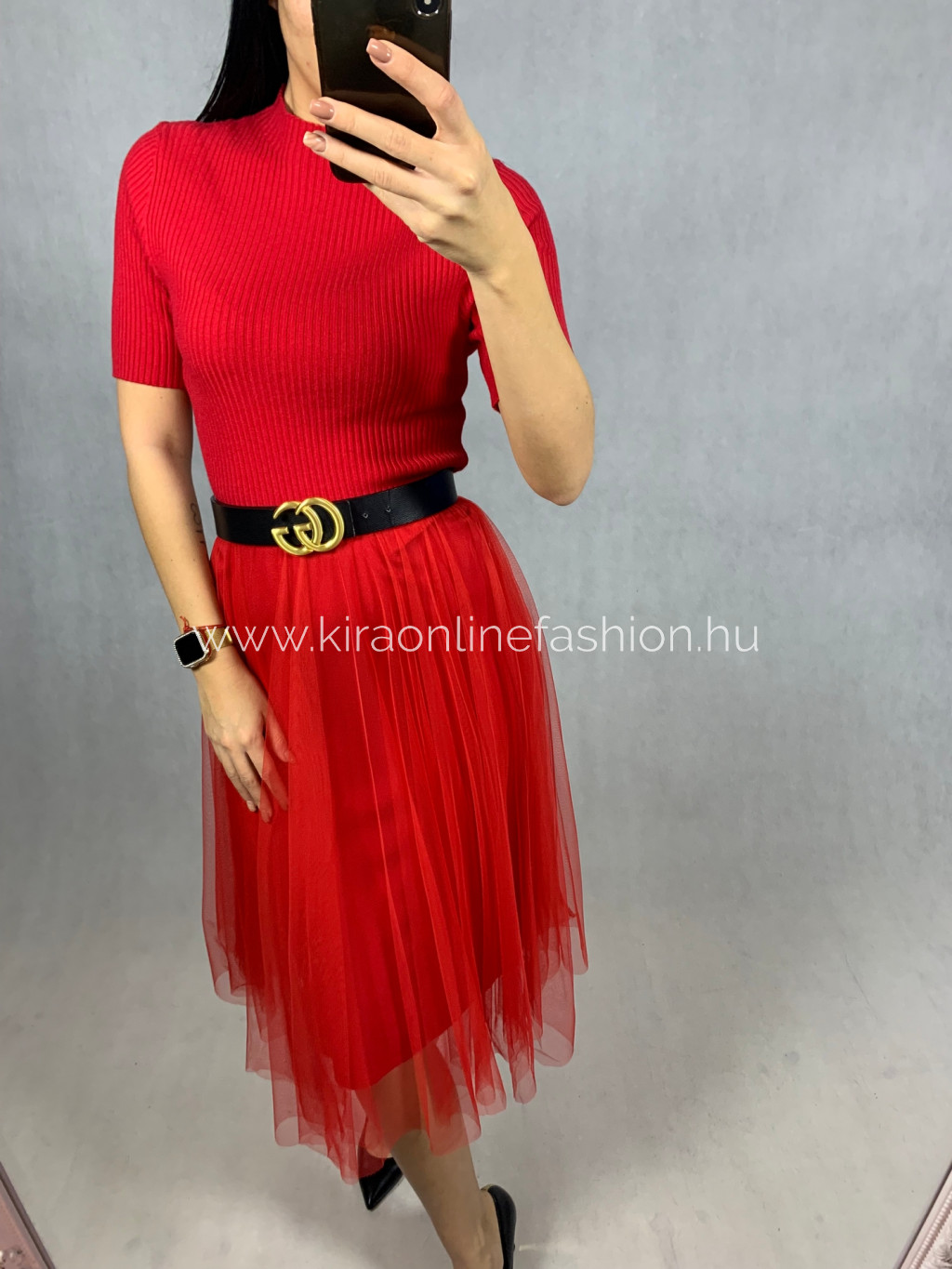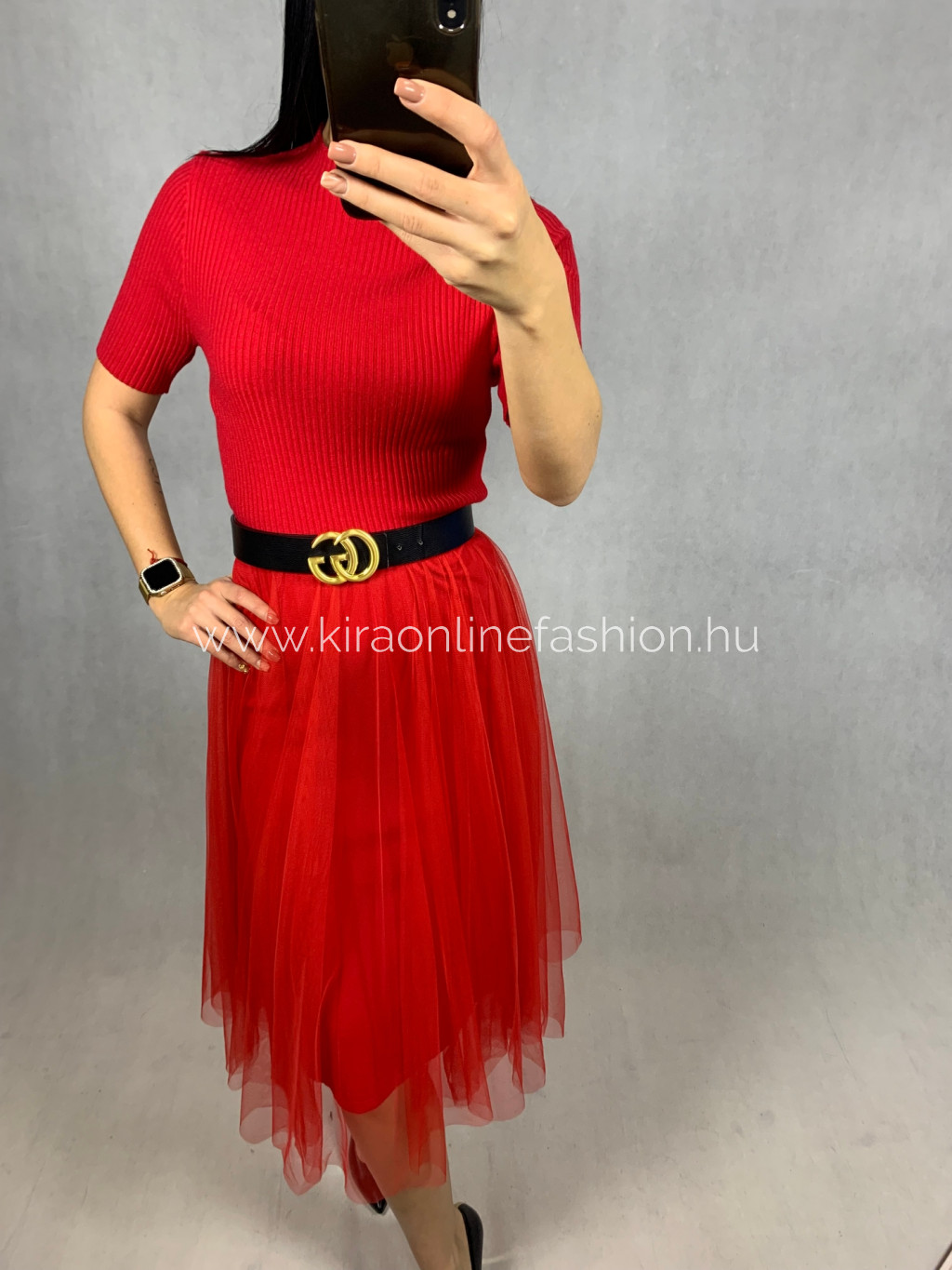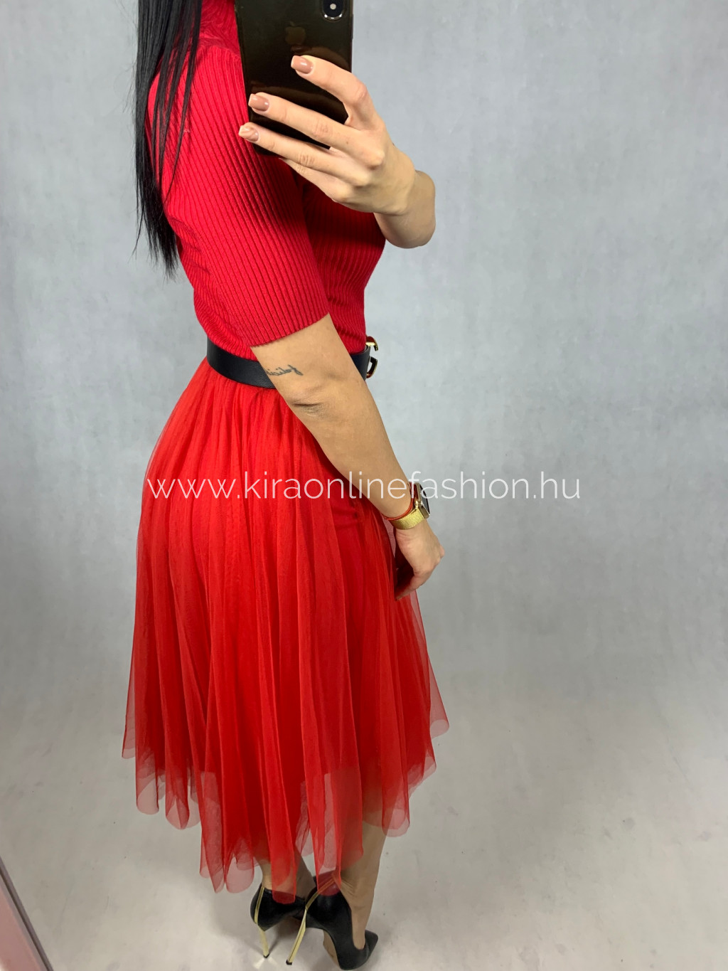 Piros derékban szabott tüllös szoknyás ruha. FElső része gépi kötött anyag. Méret nélküli. S-L méretig ajánlom. Az öv nem tarozéka a ruhának.