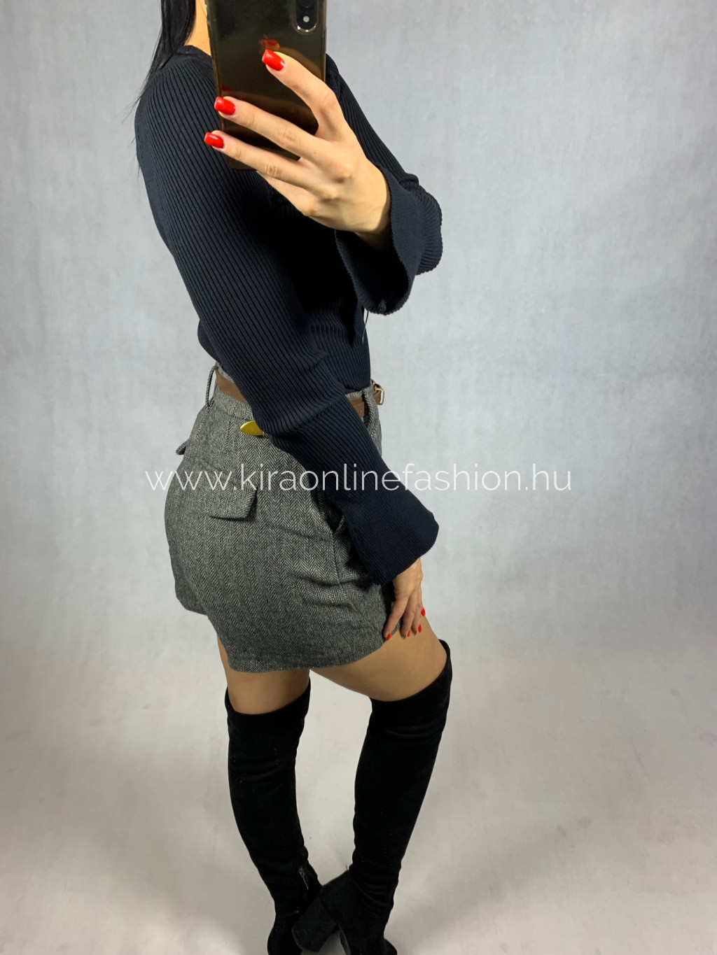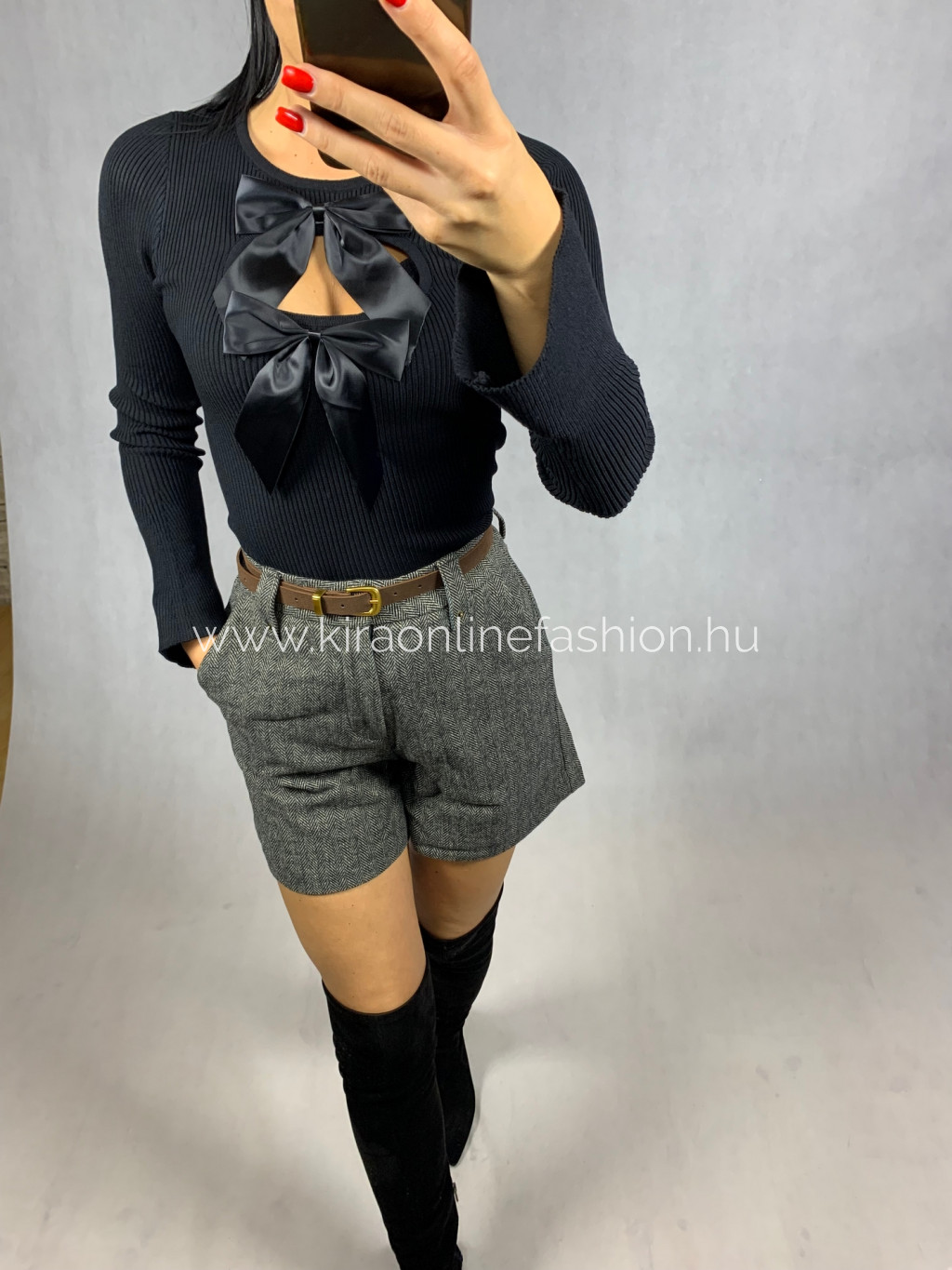 Fekete színű gépi kötött anyagú tölcsérujjú body masnikkal. A masni levehető. Méret nélküli.