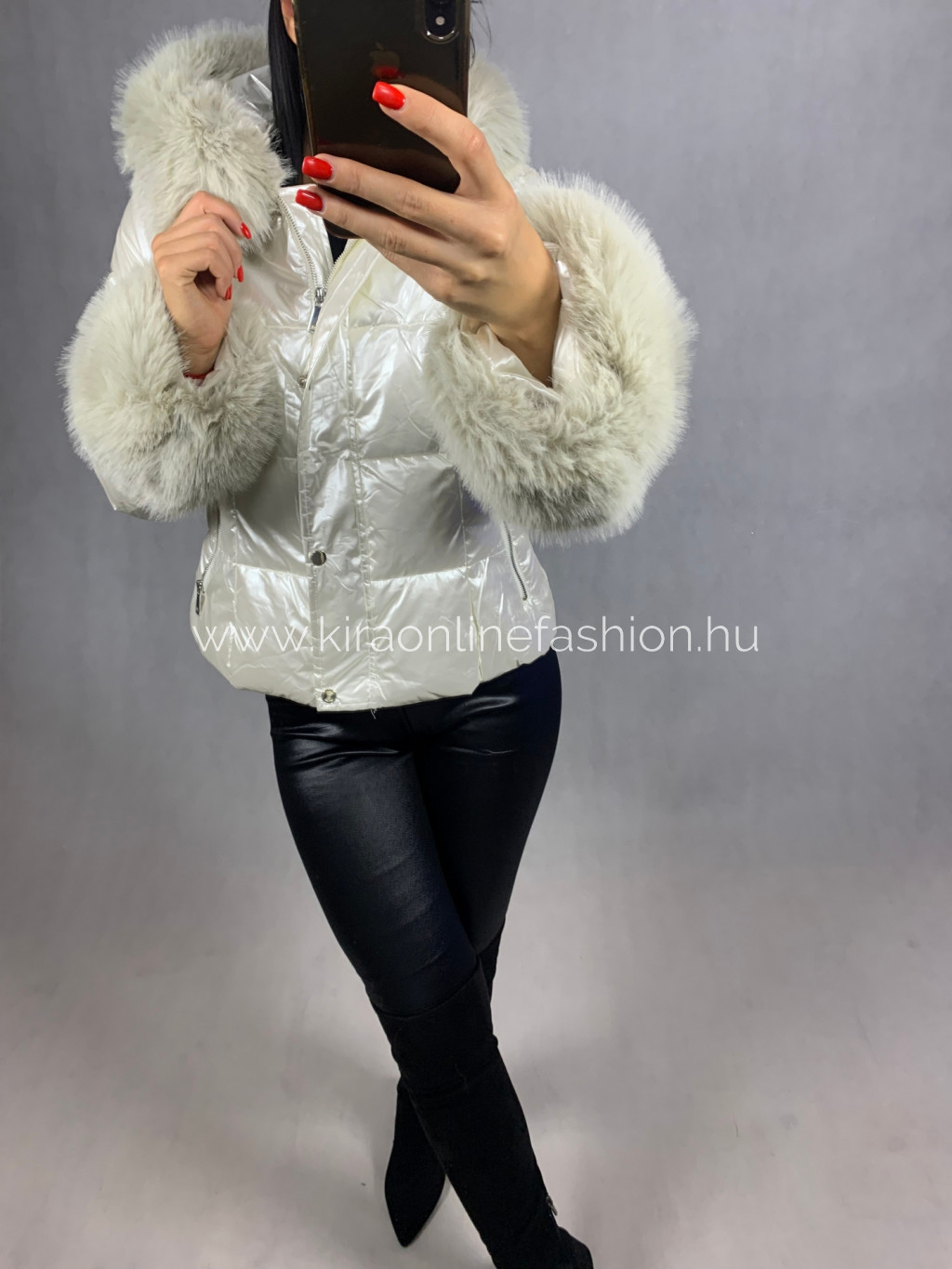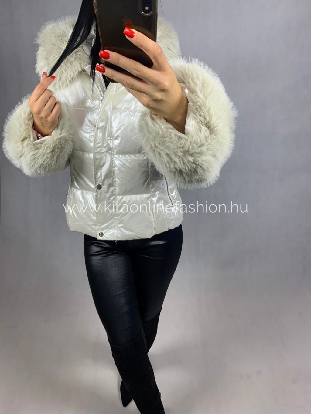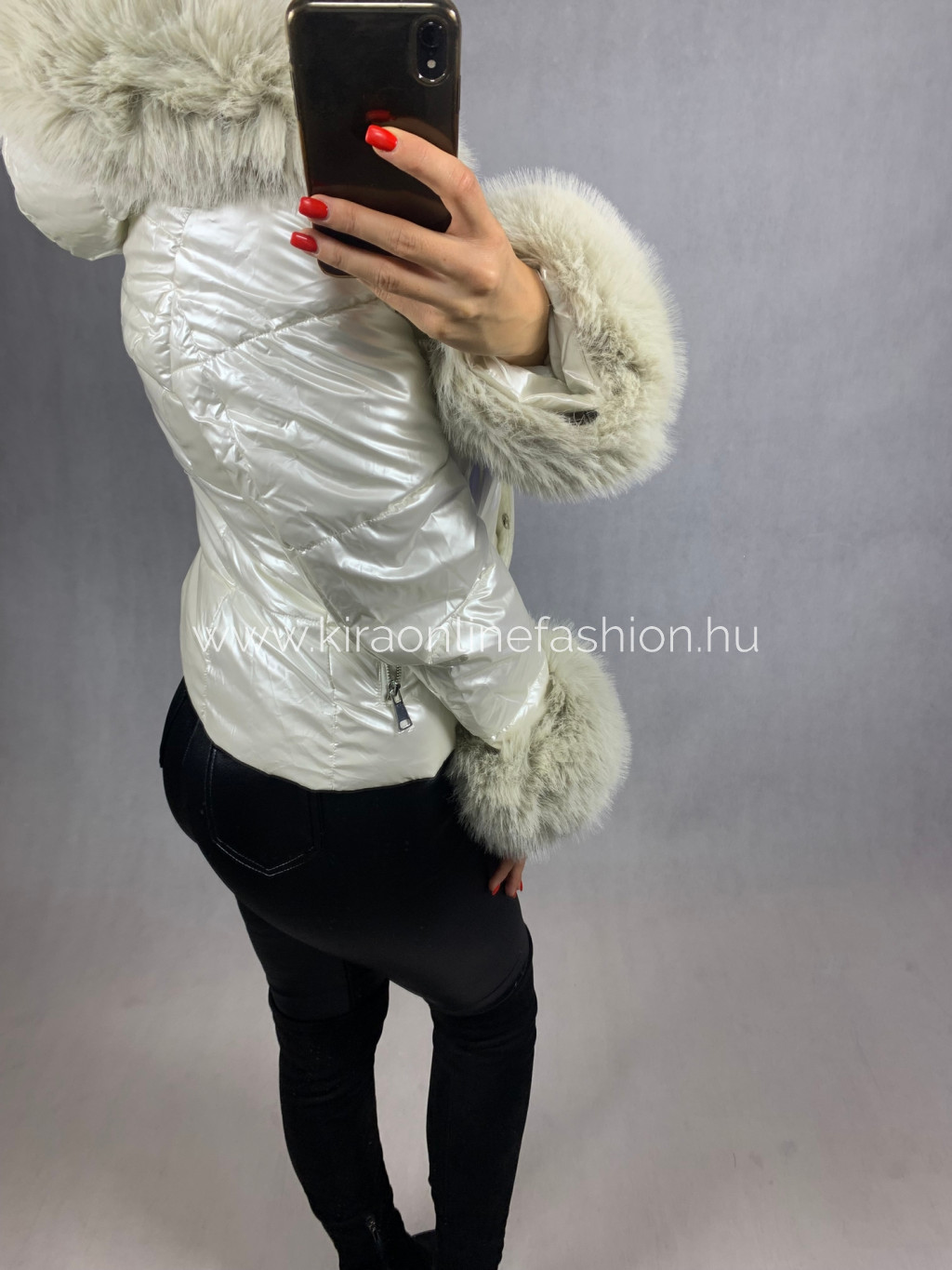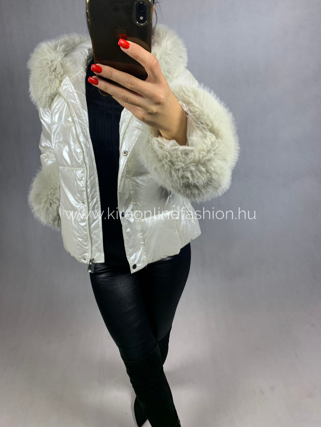 Gyöngyházfehér steppelt kapucnis téli kabát szőrmével díszítve. Méretezve van.