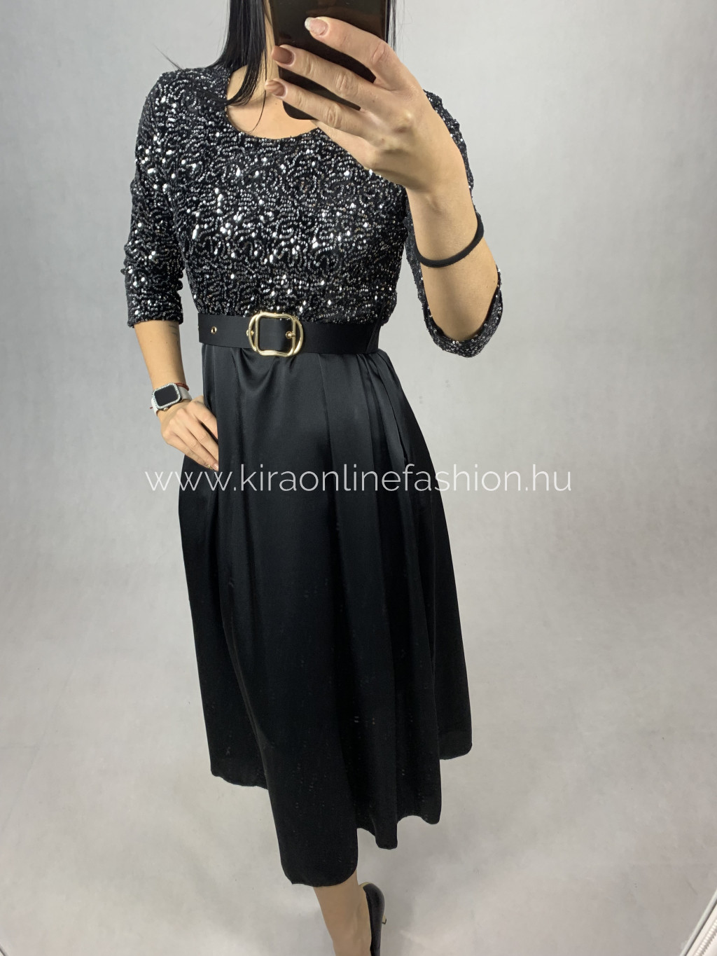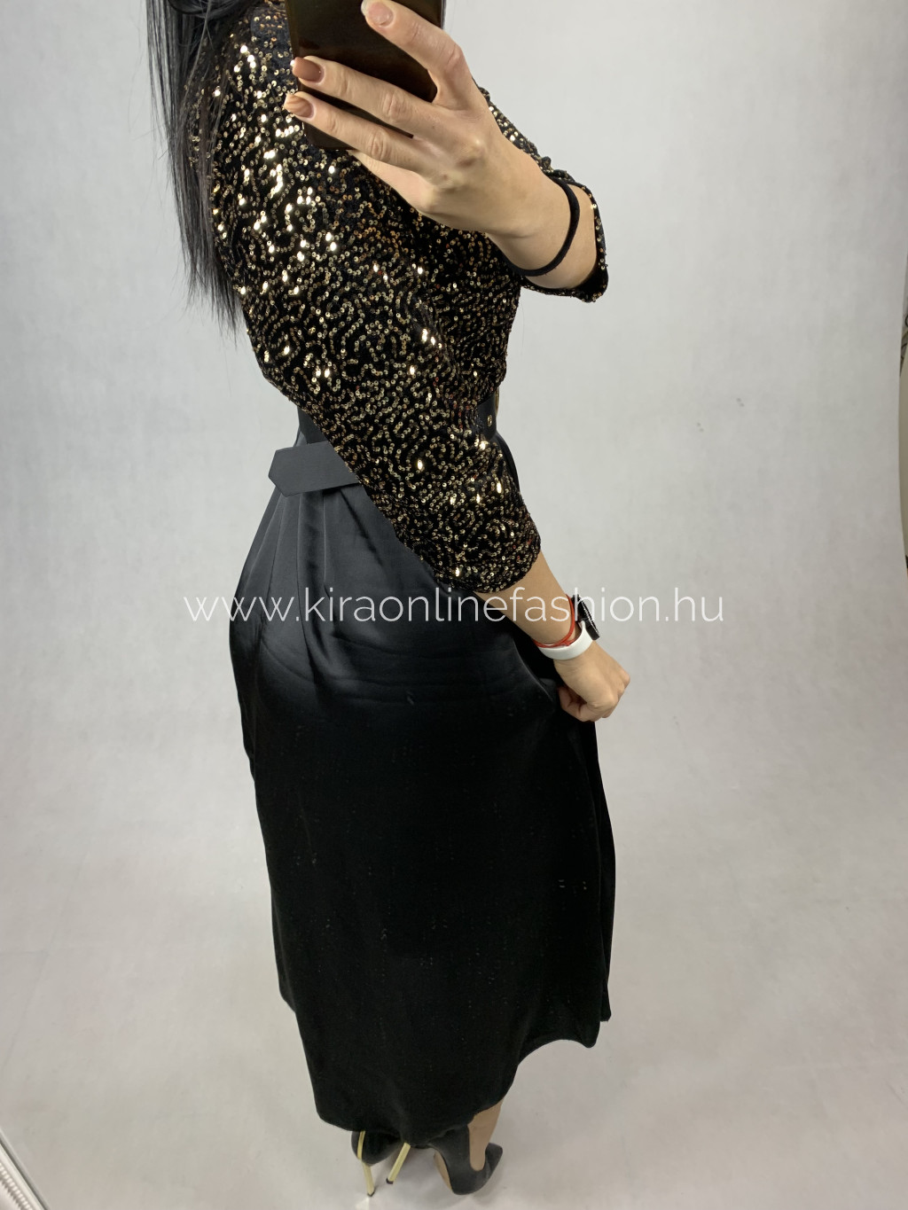 Bronz flitteres szatén anyagú loknis ruha övvel. Méret nélküli.
