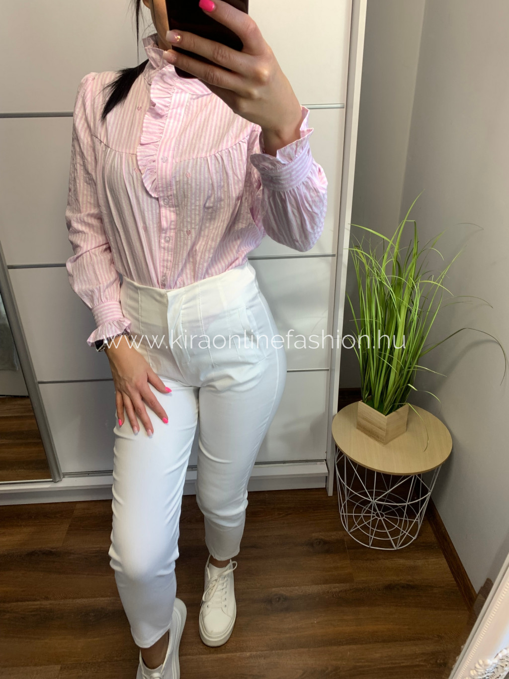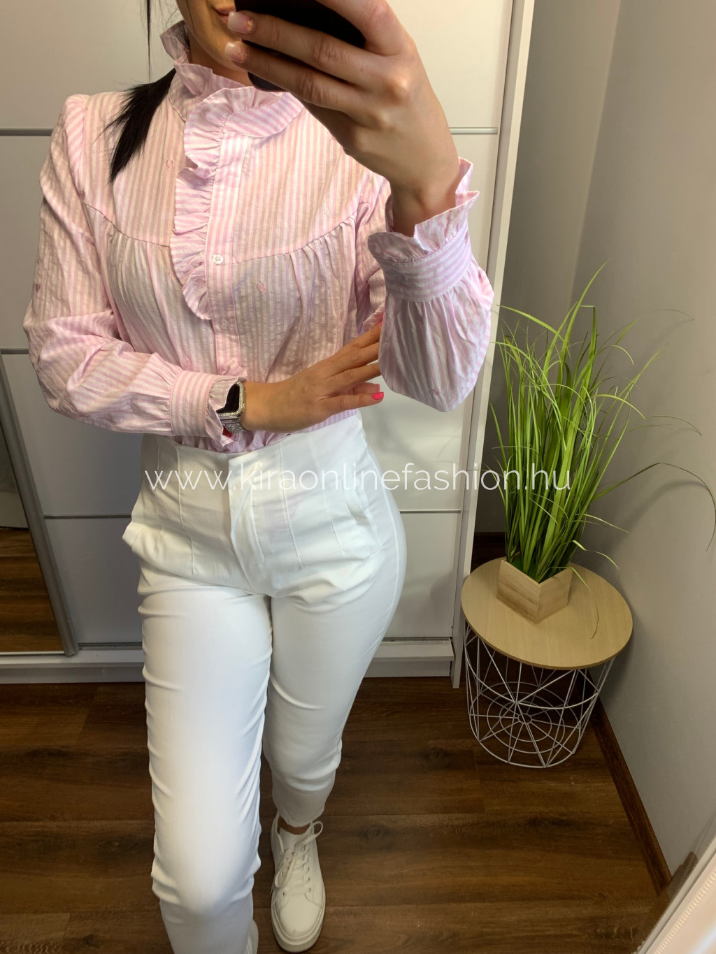 Rózsaszín csíkos fodorral díszített szívecskékkel hímzett ing. Méret nélküli.