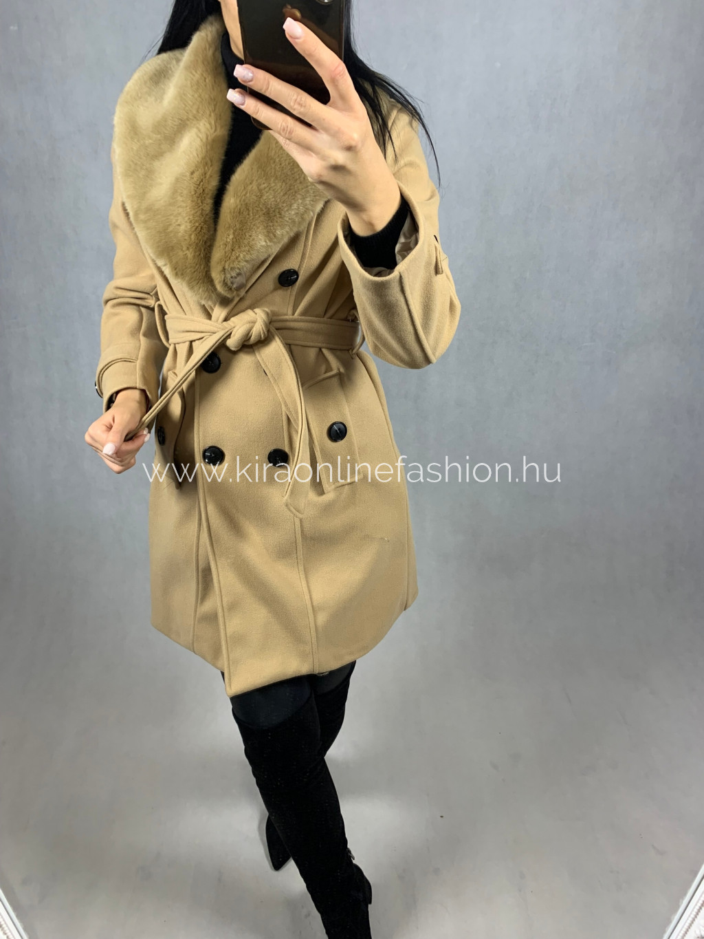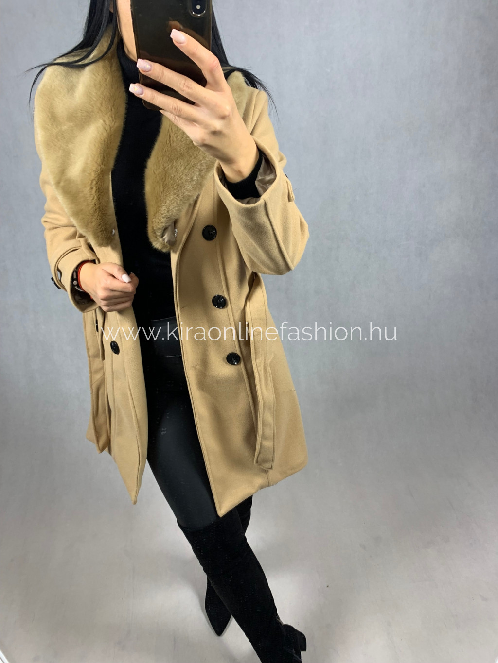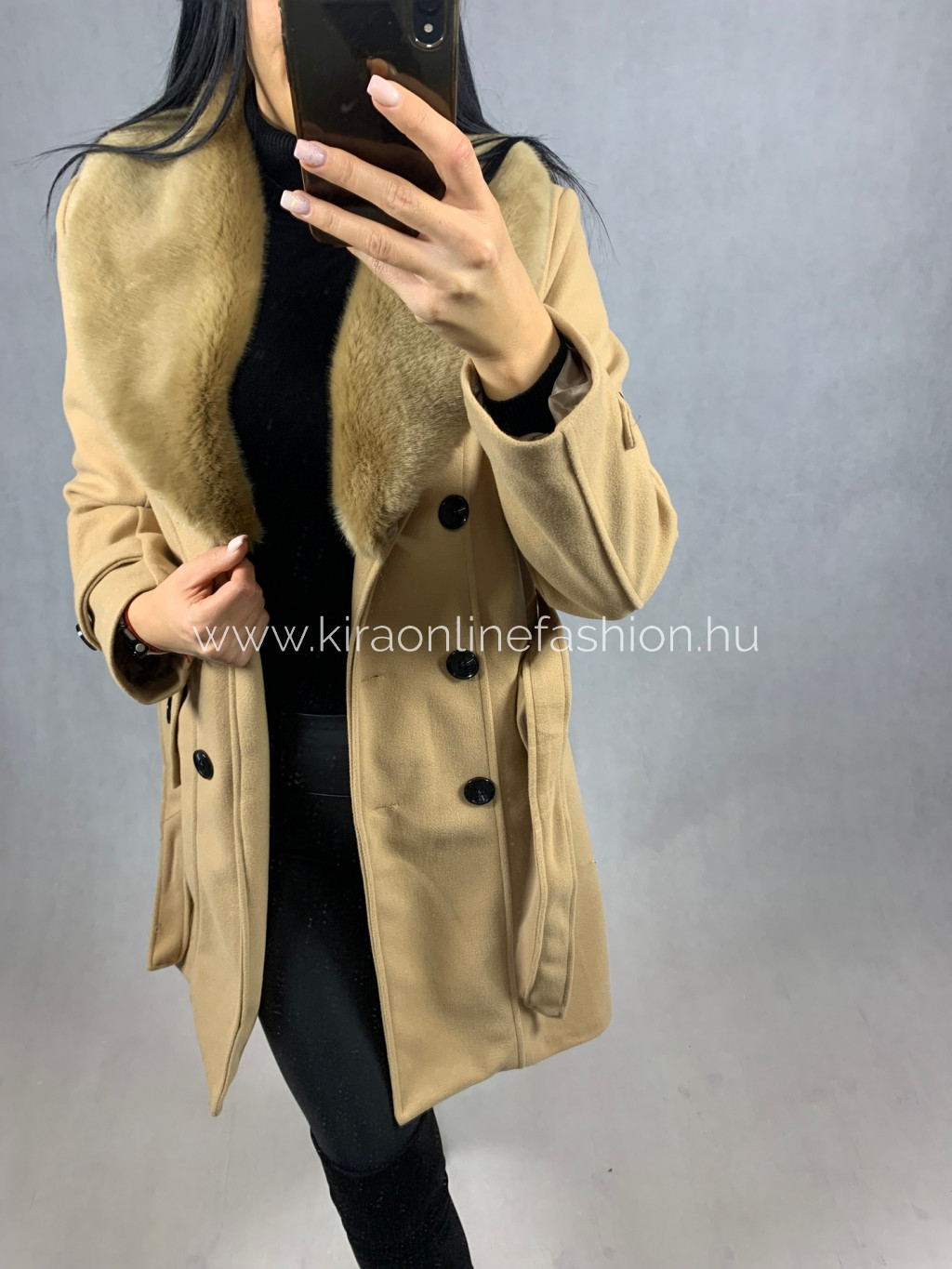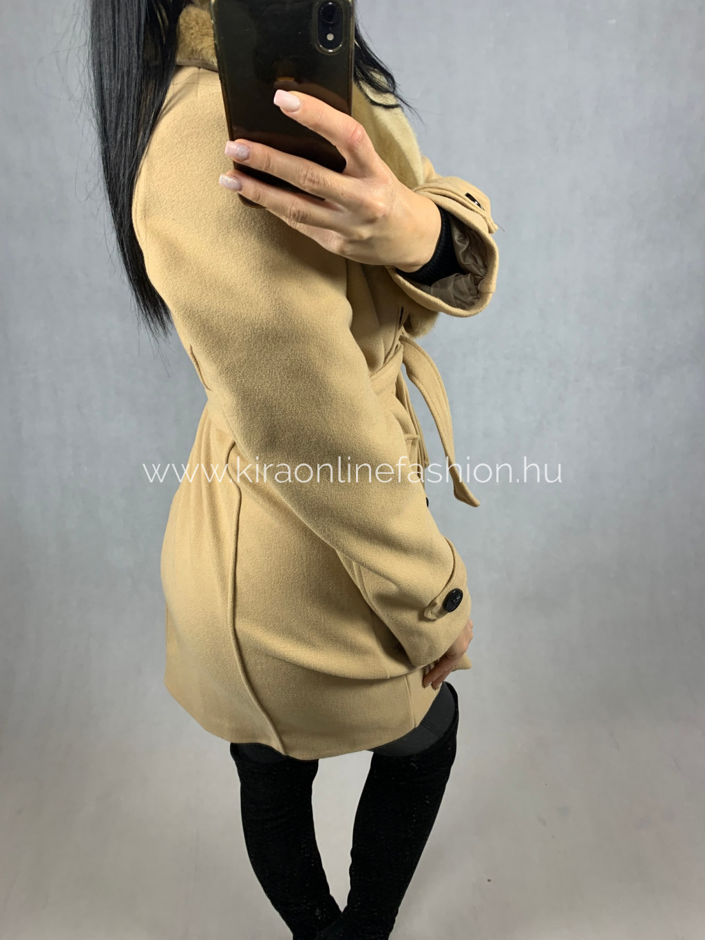 Karamell színű gombos szövetkabát saját övvel , szőrmével. A szőrme levehető. Méret nélküli.