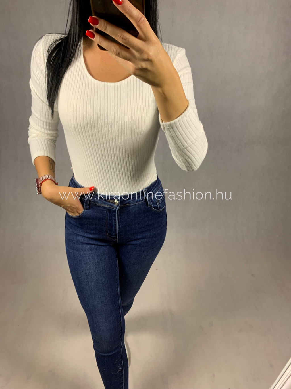 Törtfehér szinű finom kötött anyagú bordázott body. Méretezve van.
