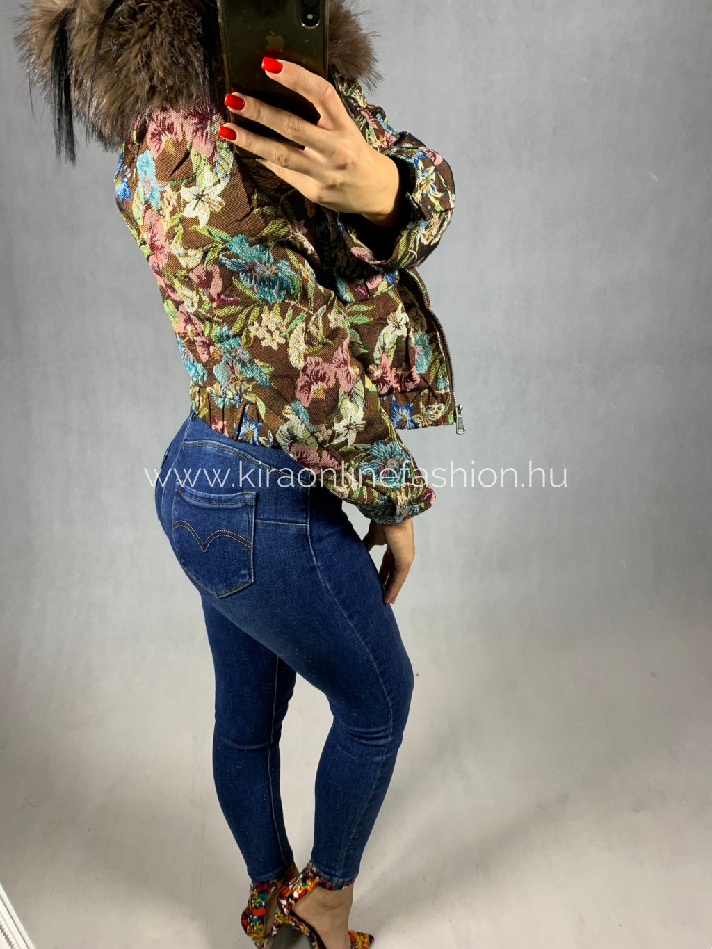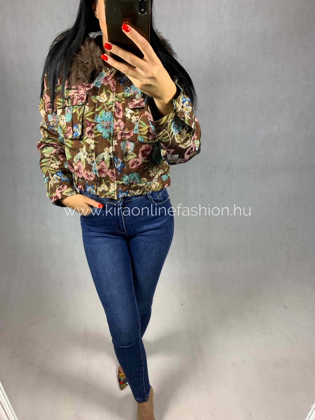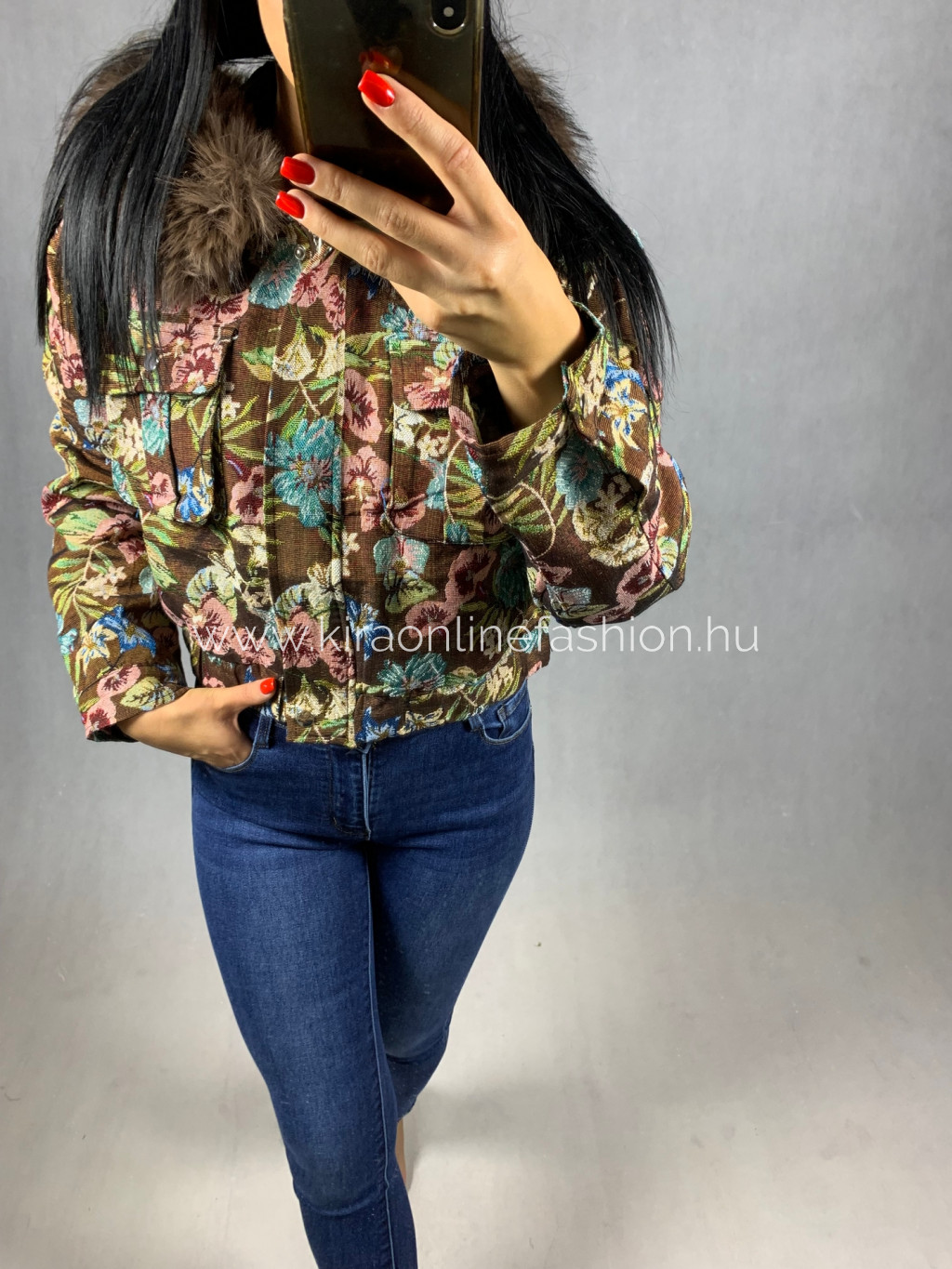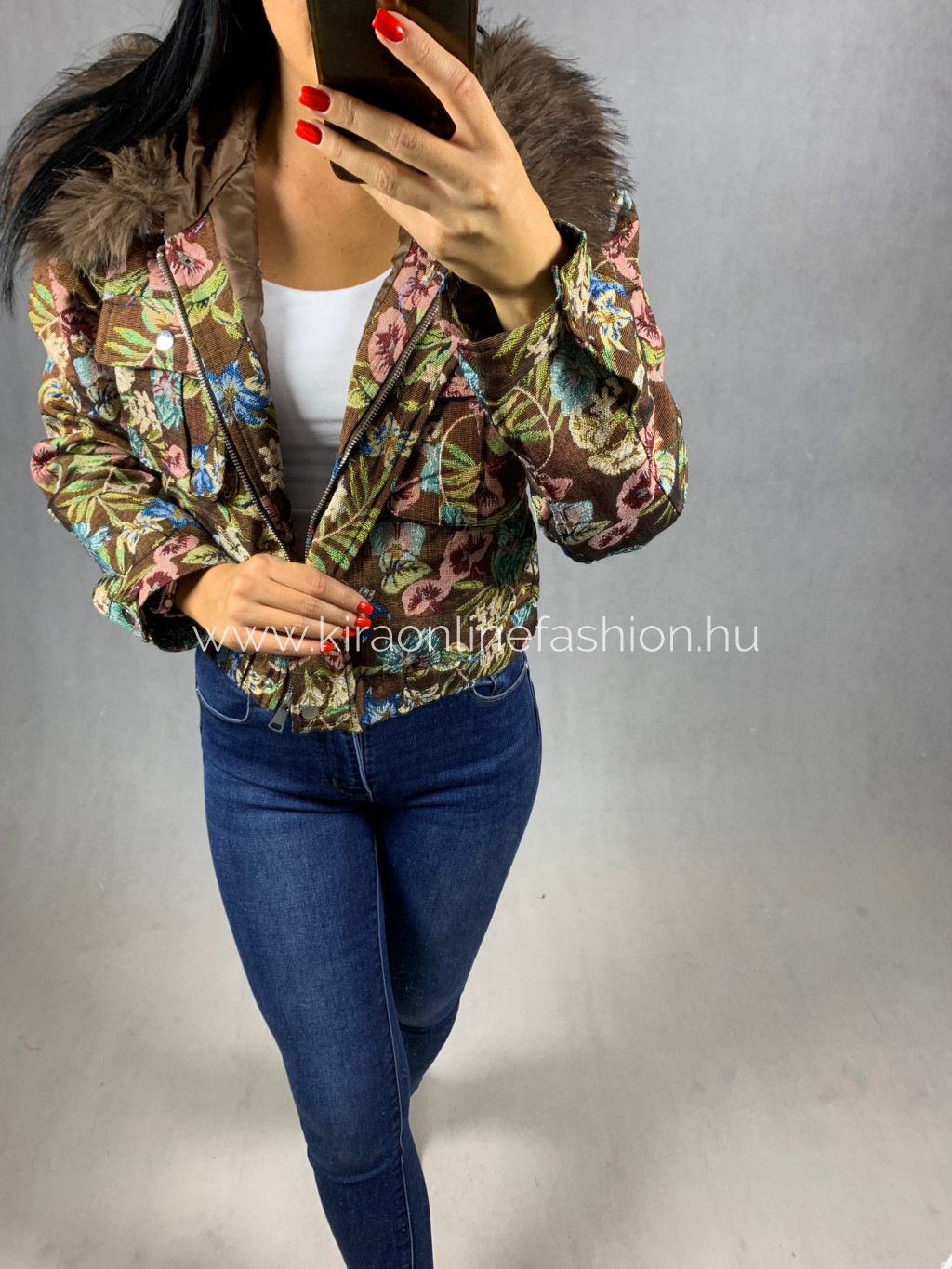 Gyönyörű barna virágmintás rövidebb fazonú átmeneti dzseki kapucnival szőrmével. A szőrme levehető.
