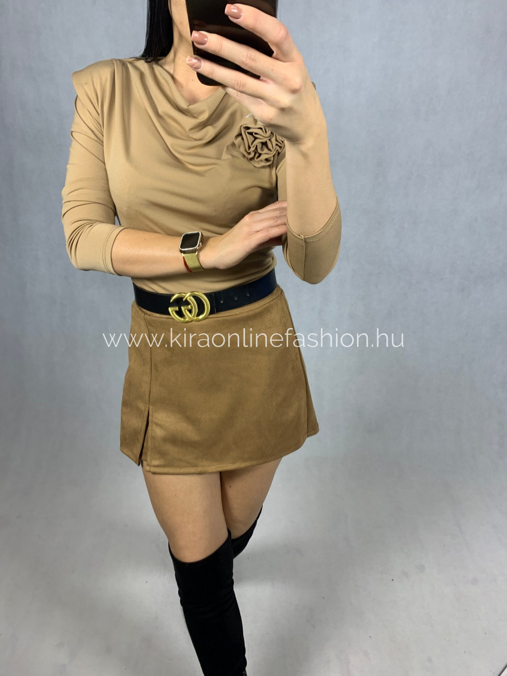 Karamell színű velúrhatású rugalmas anyagú szoknyarövidnadrág. Méret nélküli.